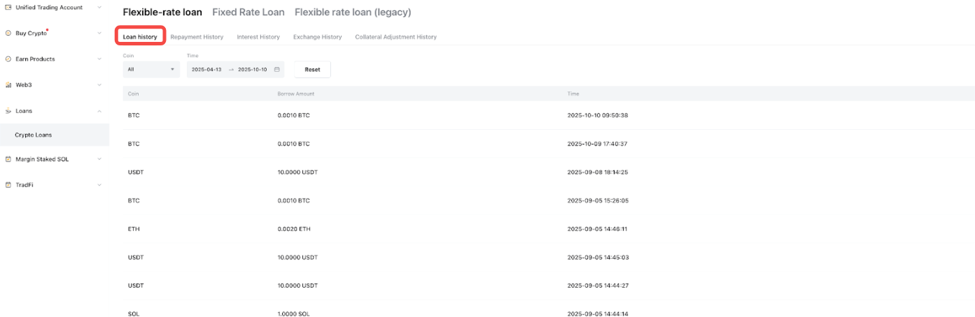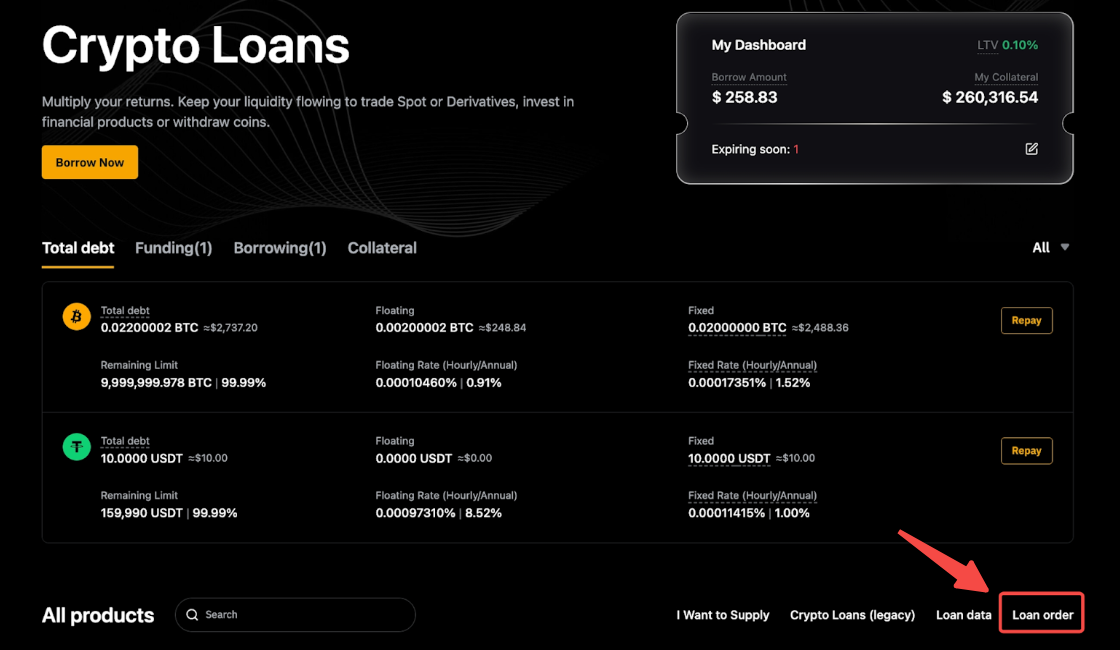 Чтобы просмотреть полный список всех ваших ордеров, нажмите на Ордер займа на панели Обзора. Вы можете просмотреть все ордера криптозаймов, переключаясь между вкладками продуктов в верхней части экрана, включая Обязательства - Гибкие, Обязательства - Фиксированные. Здесь вы найдете подробную информацию о вашем займе, платежах, процентах, обеспечении и многом другом. Можно также отфильтровать результаты по активу или времени.