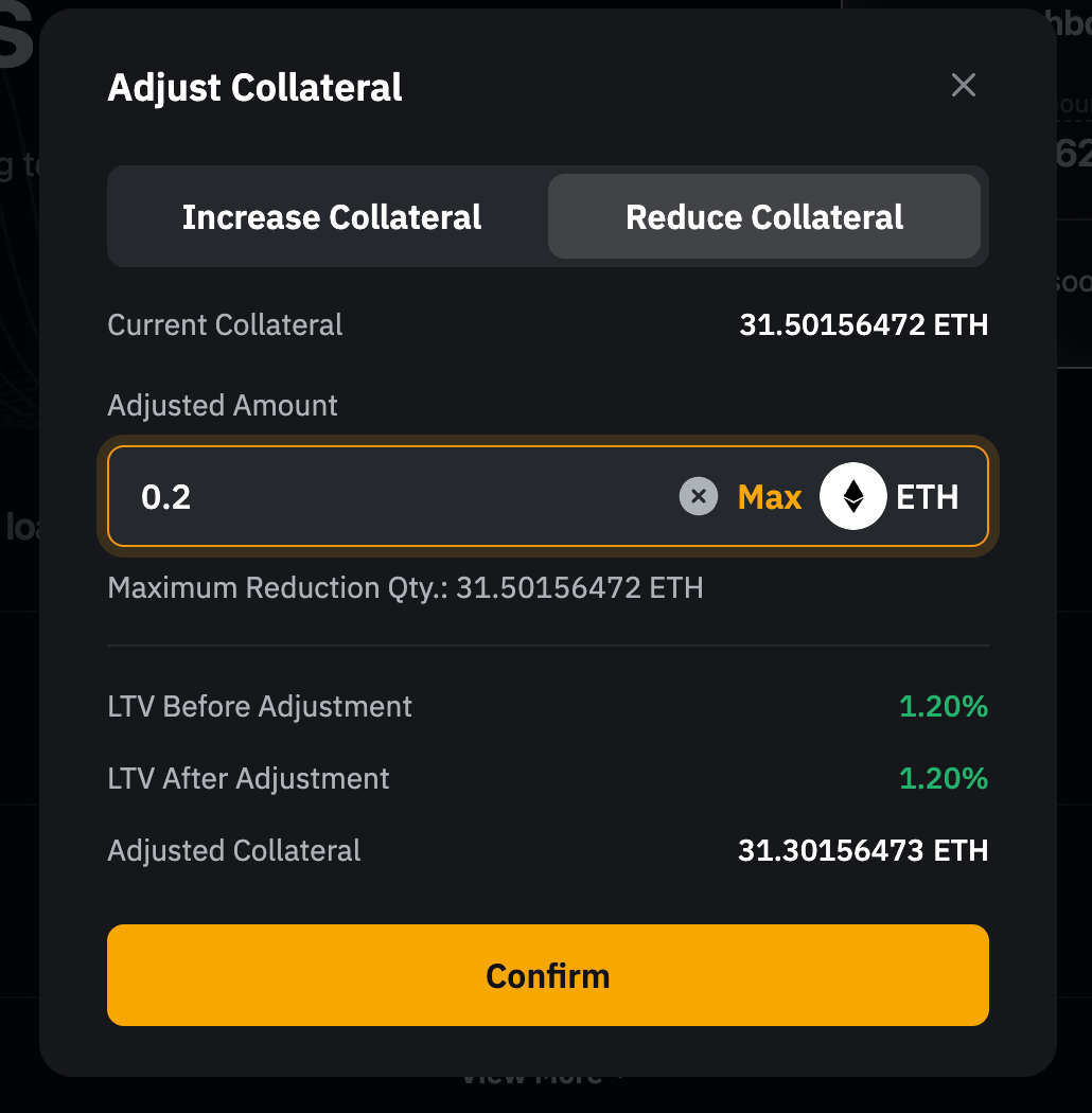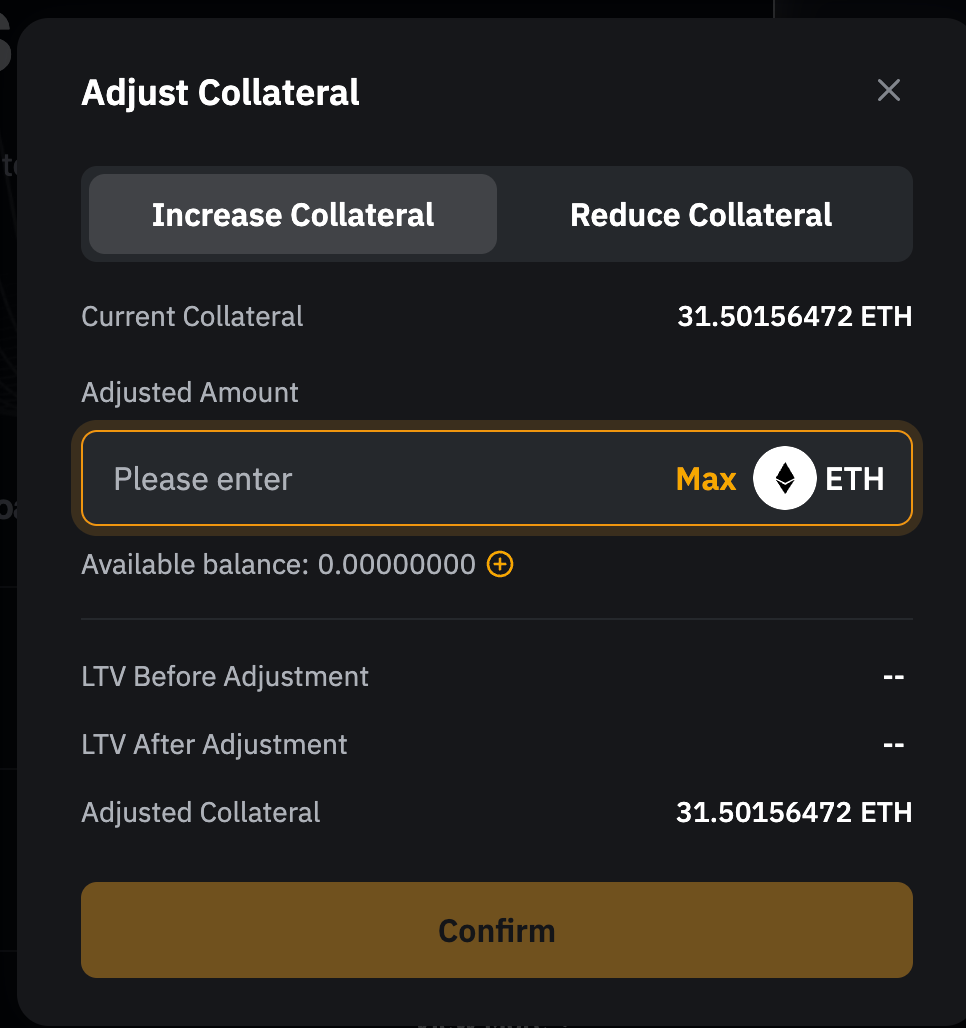 Шаг 2. Чтобы изменить сумму обеспечения, перейдите на вкладку Увеличение обеспечения. Введите сумму, которую вы хотите добавить, или нажмите Макс., чтобы использовать весь доступный баланс на аккаунте финансирования. Добавление обеспечения снижает LTV и уменьшает риск ликвидации.