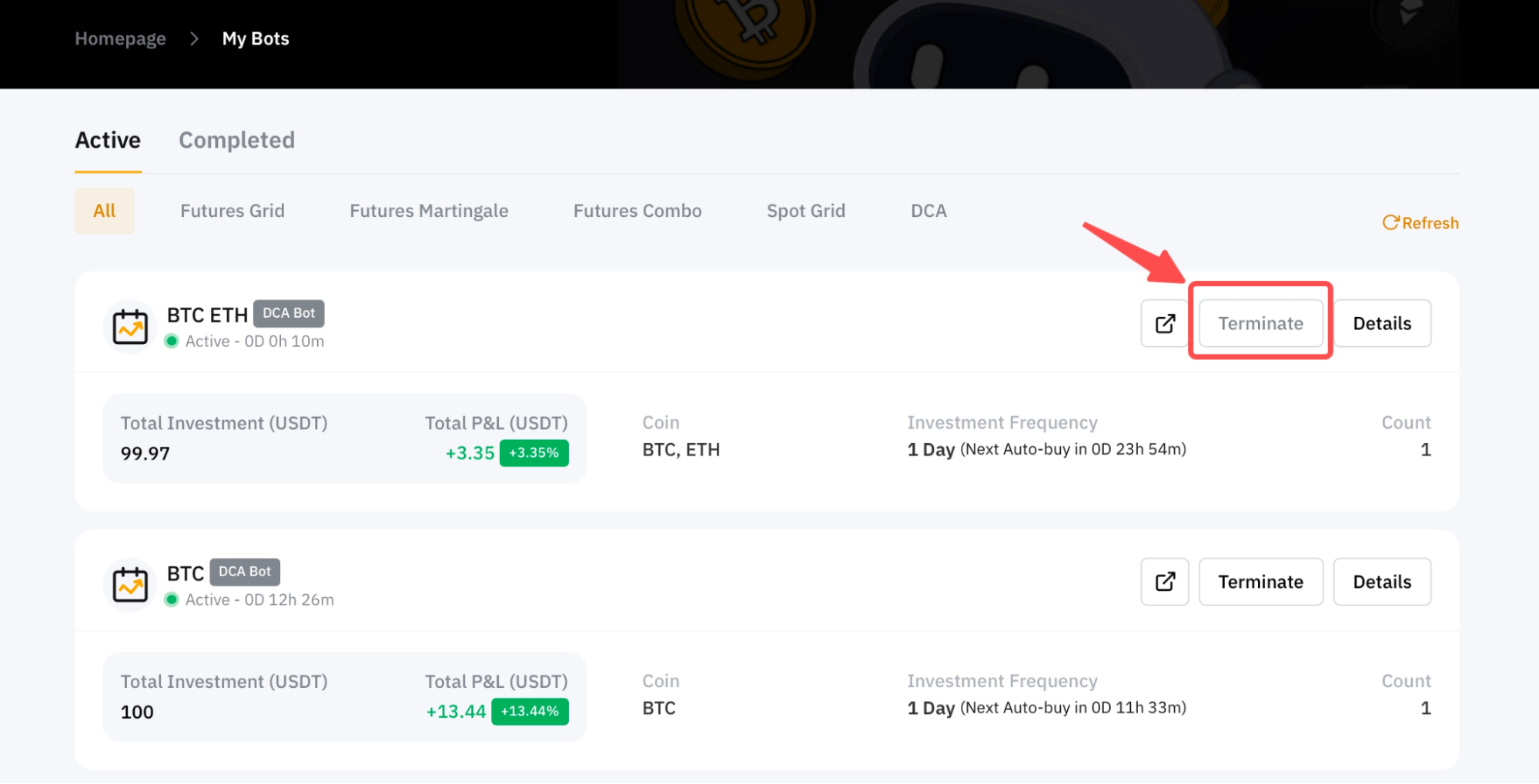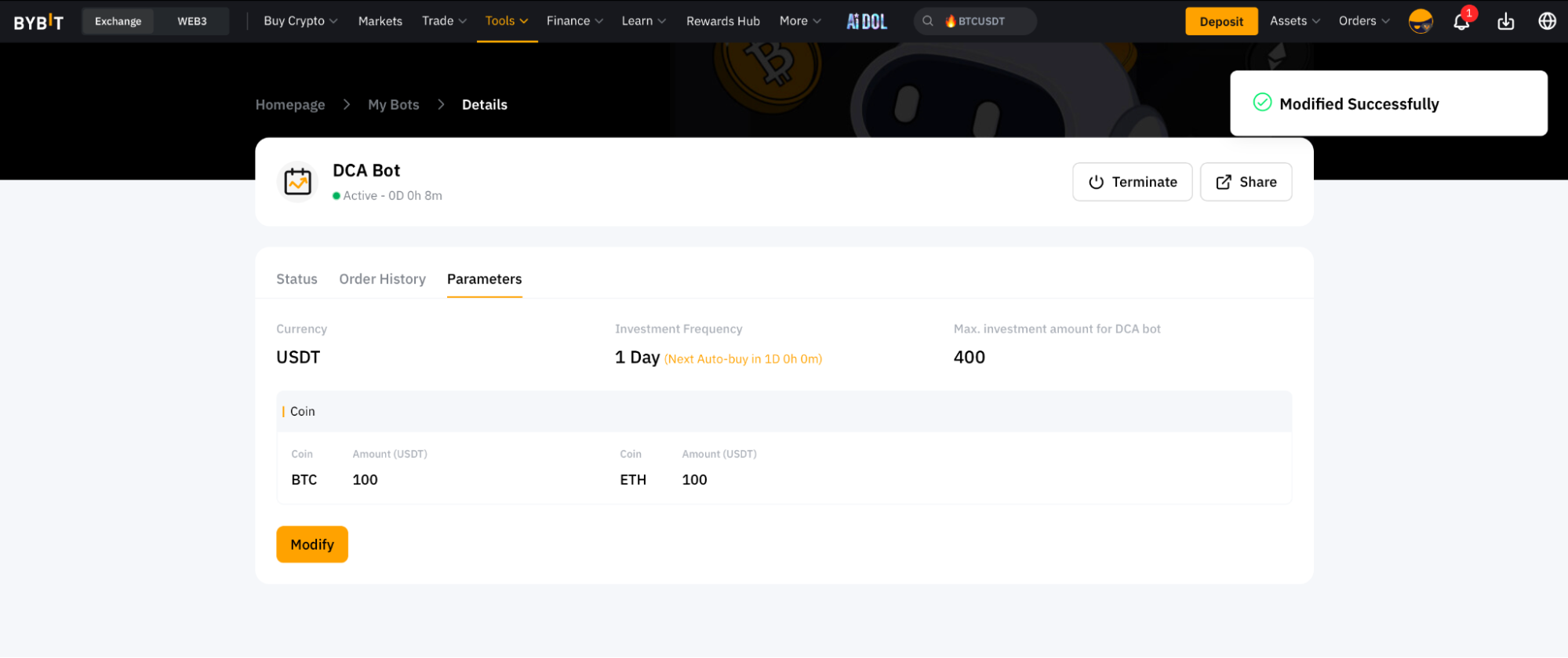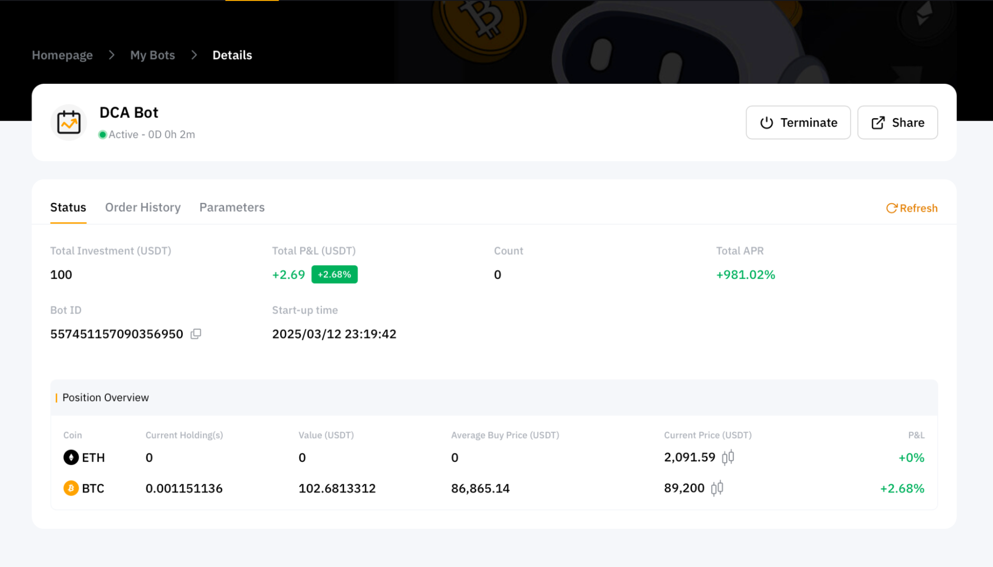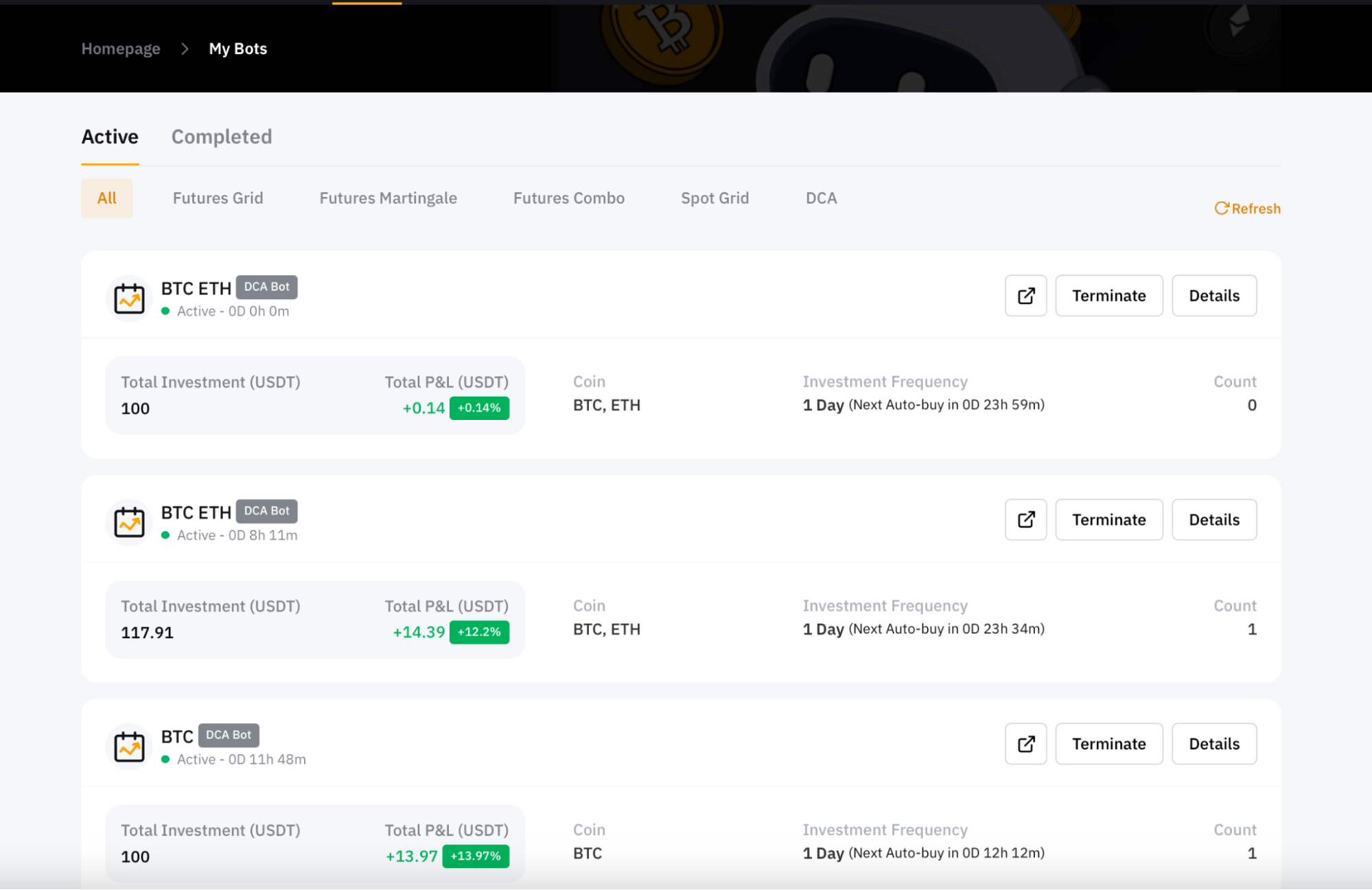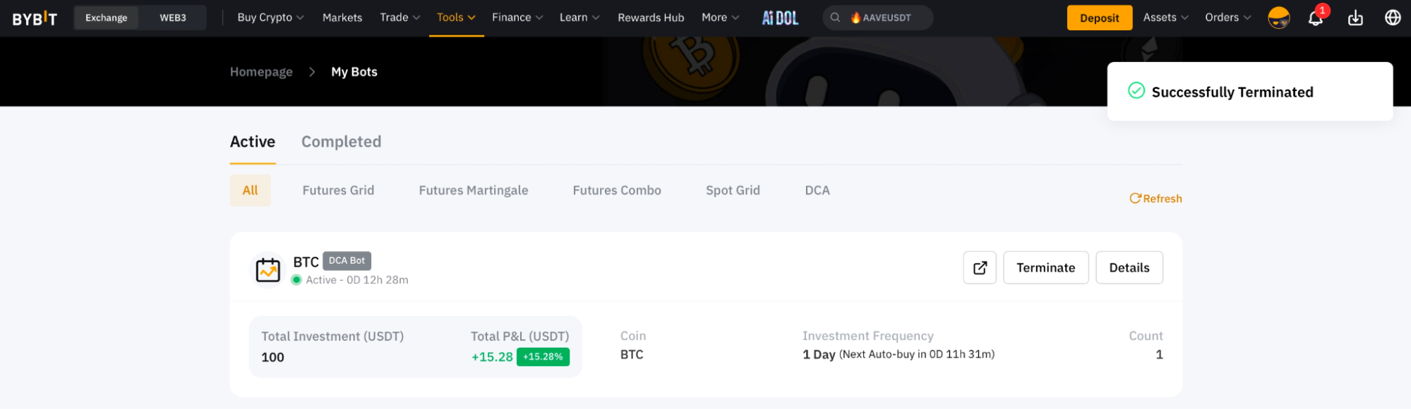 После нажатия на кнопку Подтвердить вы будете перенаправлены в раздел Мои боты, где сможете просмотреть своих активных DCA-ботов.