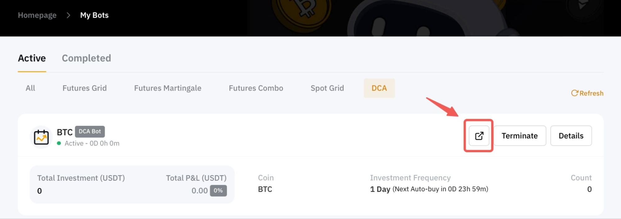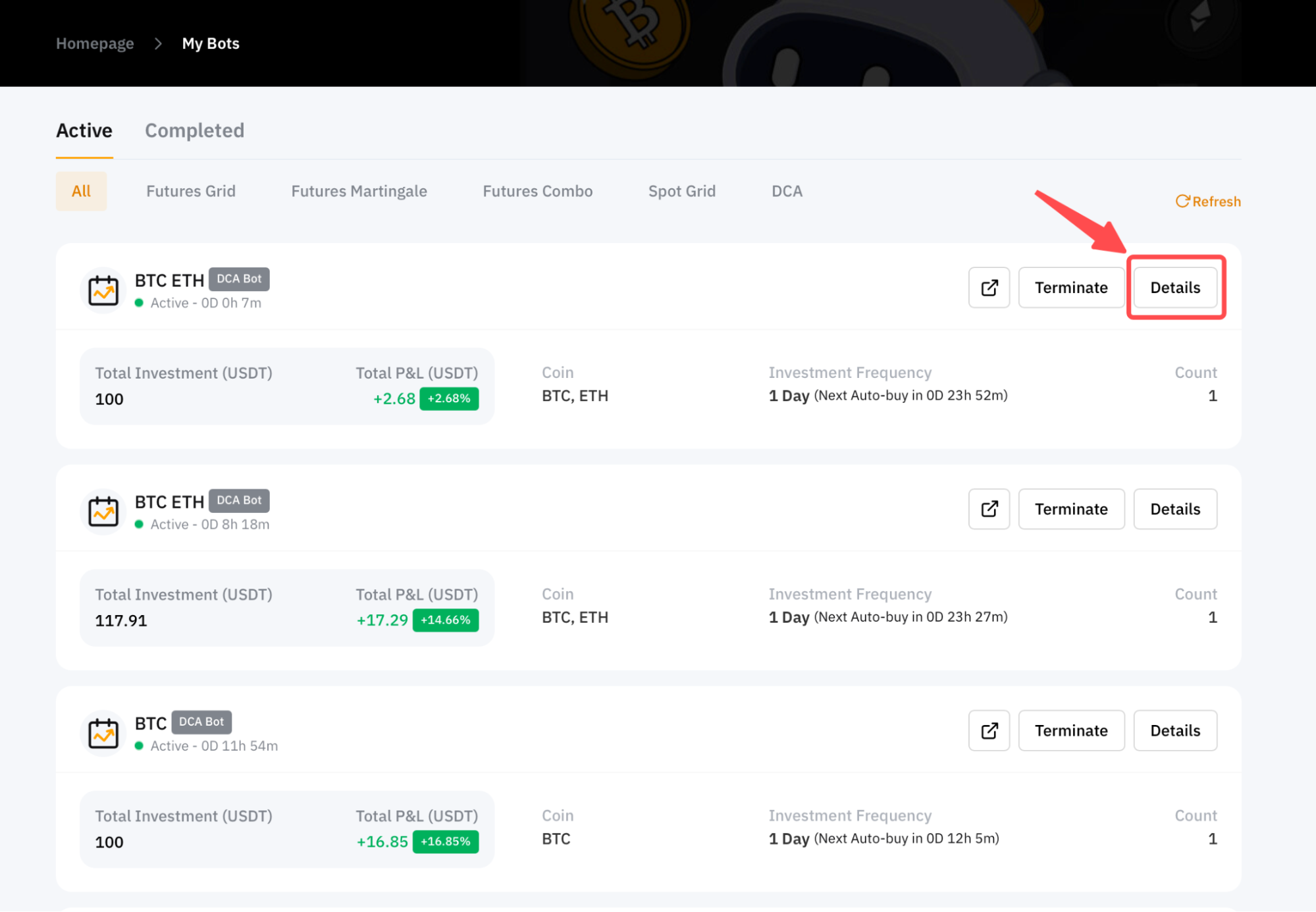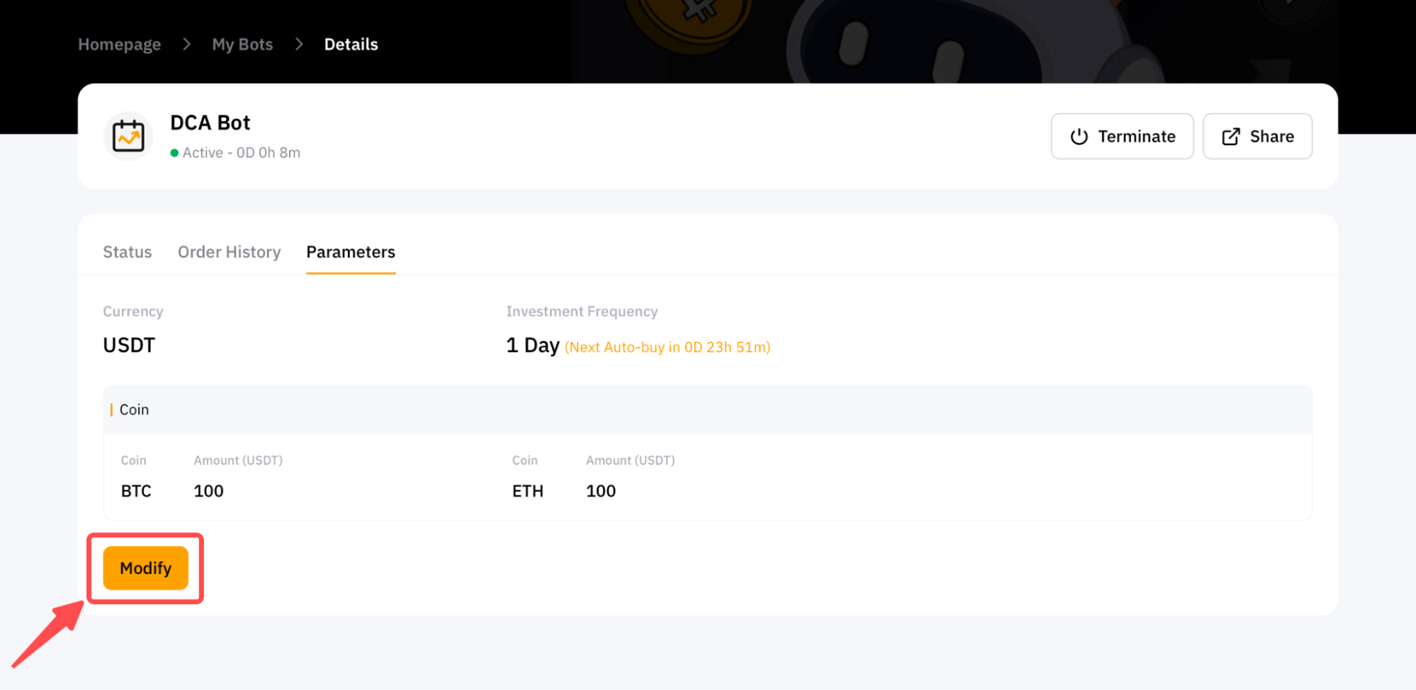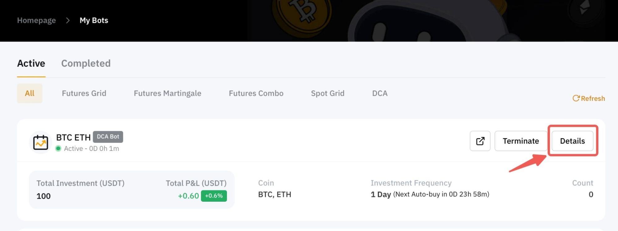 Шаг 1: нажмите Просмотреть моих ботов в верхнем левом углу страницы торгового бота Bybit. Затем нажмите Подробная информация в правом верхнем углу DCA-бота, параметры которого вы хотите изменить.