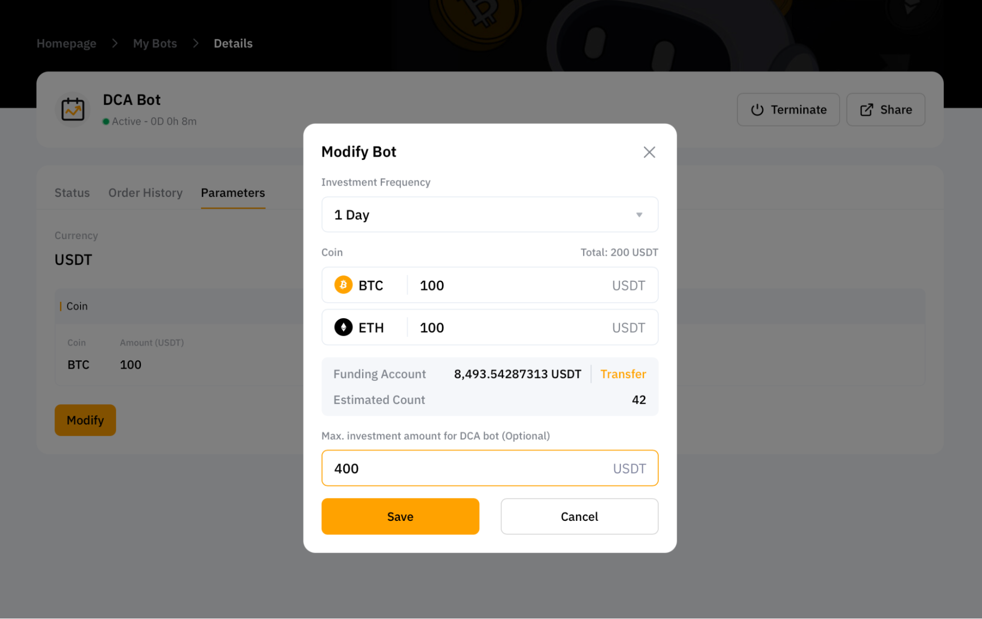 — Новая DCA-стратегия вступит в силу сразу после изменения и успешного сохранения параметров.