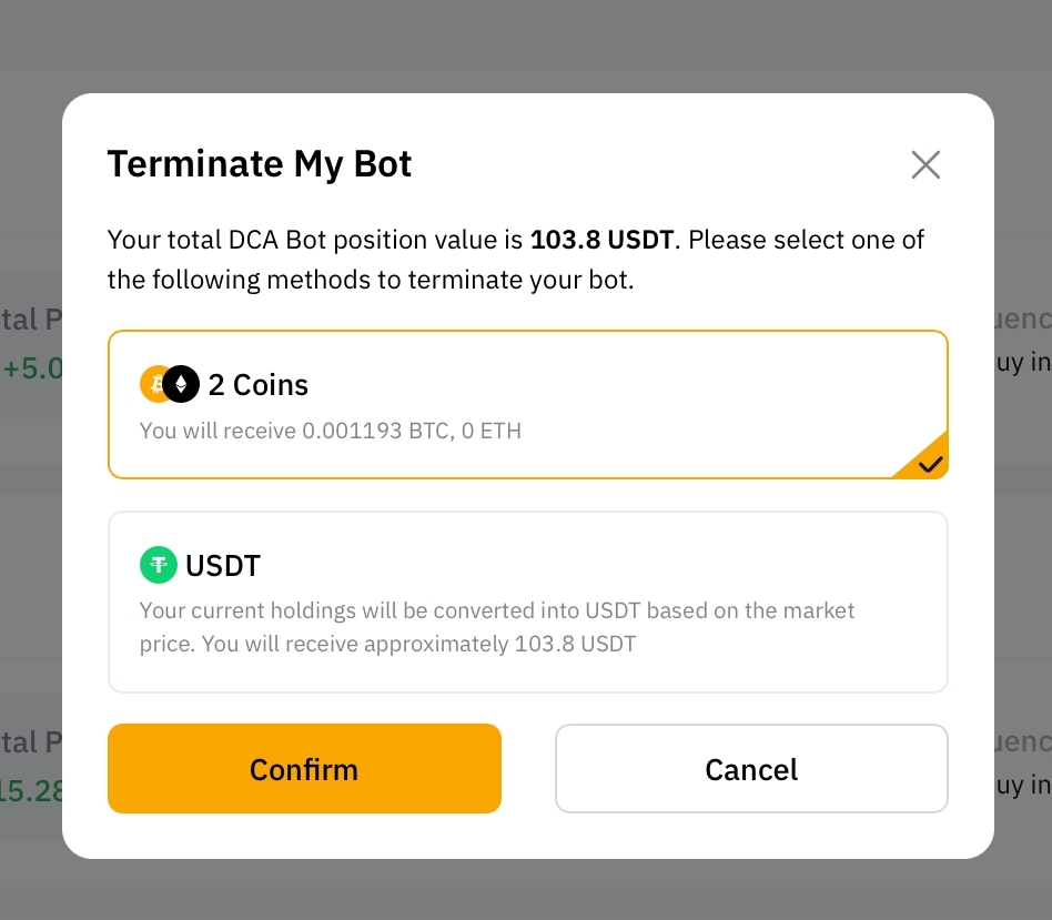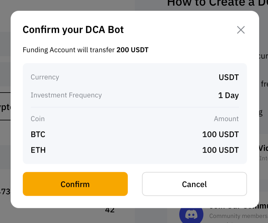 Шаг 4: перепроверьте указанную информацию о создаваемом DCA-боте, а затем нажмите Подтвердить.