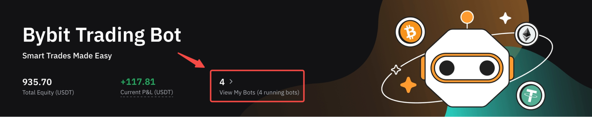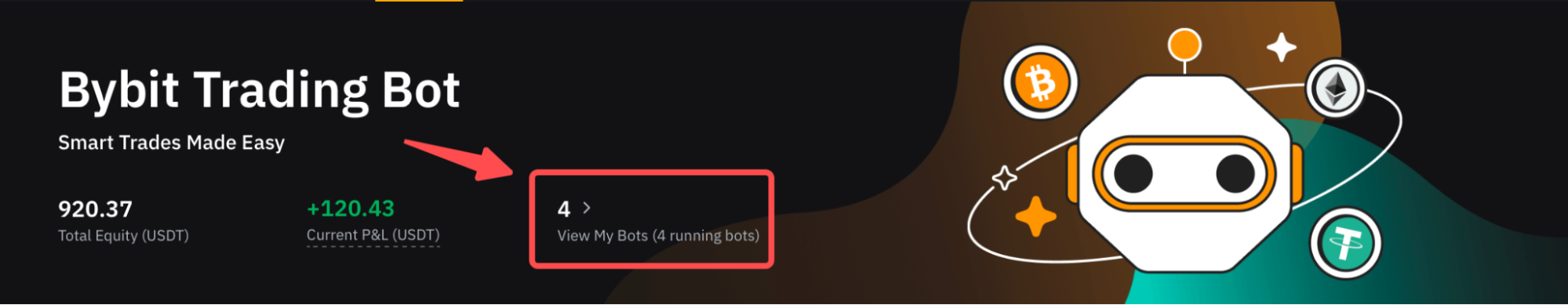 Шаг 1: нажмите Просмотреть моих ботов в разделе Торговый бот Bybit, чтобы перейти на страницу Мои боты.