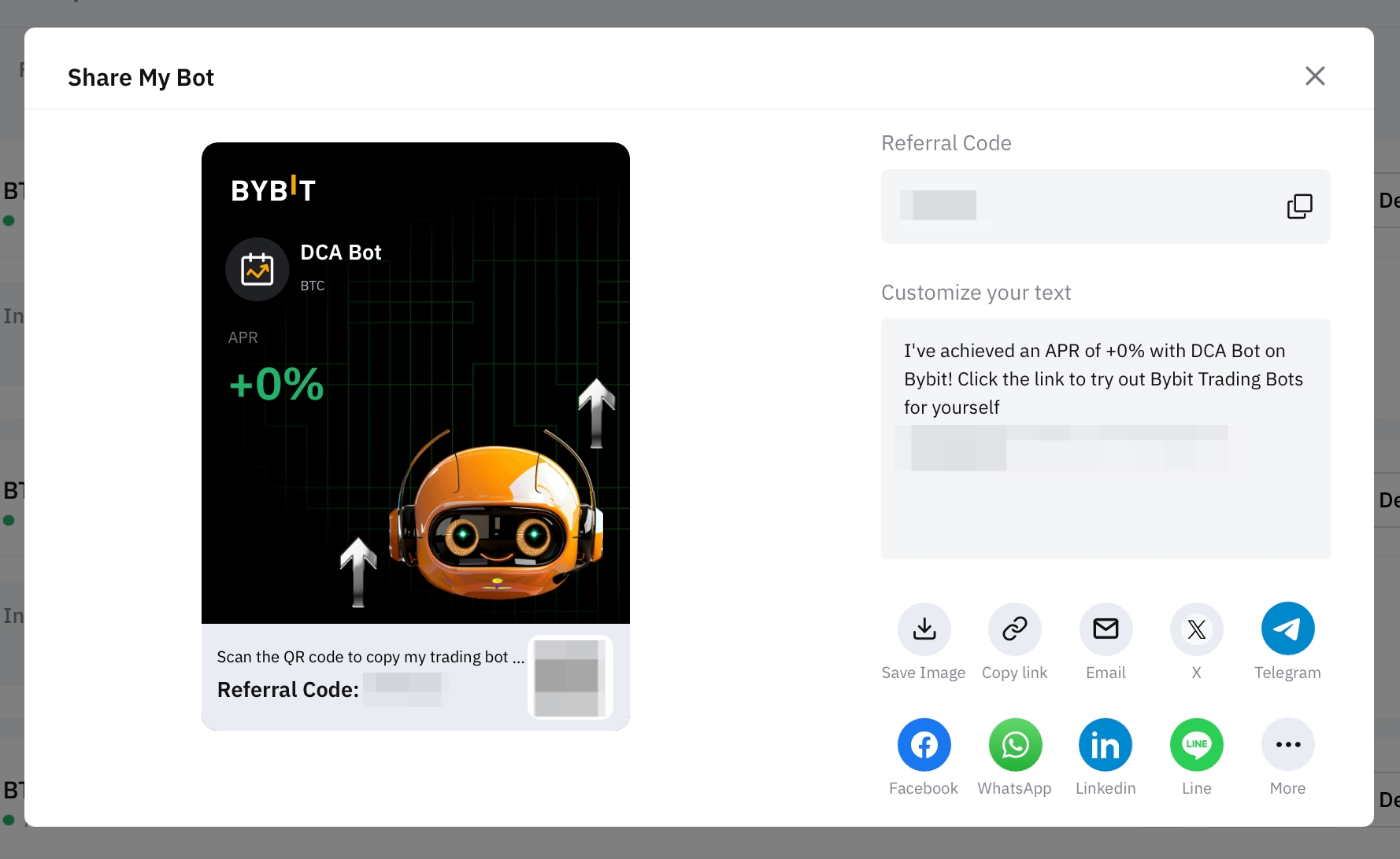Шаг 1: нажмите Просмотреть моих ботов в разделе Торговый бот Bybit, чтобы перейти на страницу Мои боты. Затем нажмите Поделиться в правом верхнем углу от DCA-бота, чтобы предоставить другим пользователям доступ к этому боту.