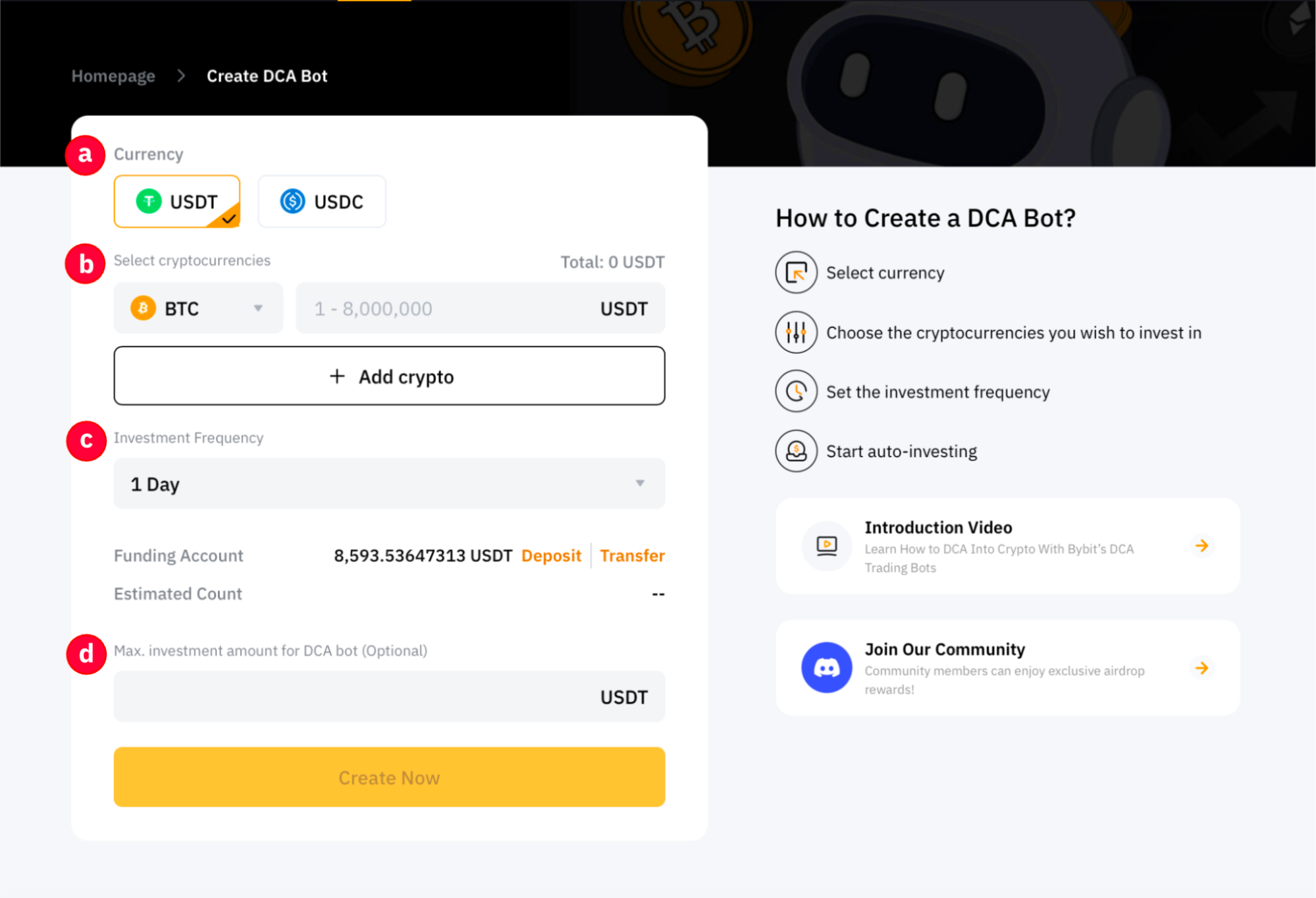 Шаг 2: нажмите Создать, чтобы перейти на страницу Создания DCA-бота.
