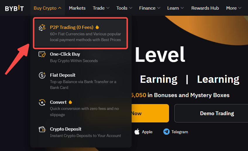 Шаг 1: Нажмите Купить криптовалюту → P2P Торговля в верхней левой части панели навигации, чтобы перейти на торговую страницу P2P.