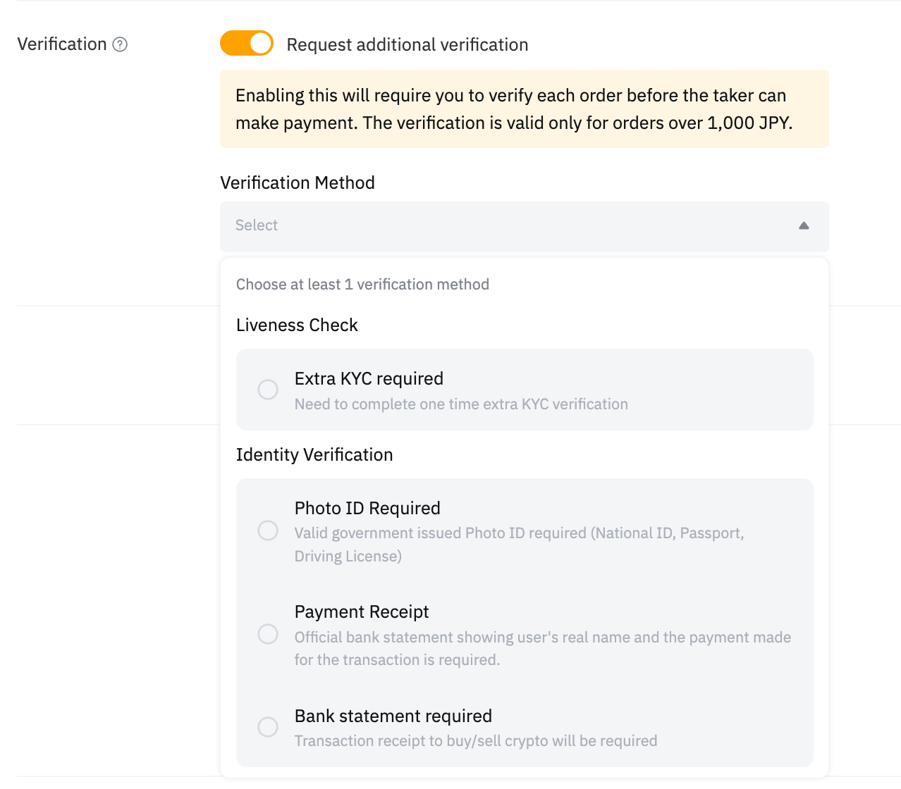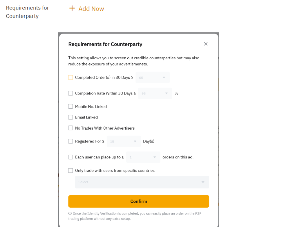 Если требования к верификации включены проверенным мерчантом (ПМ) и блочным мерчантом (БМ), тейкеры должны пройти проверку с мерчантами, когда ордер превысит указанный порог фиатной валюты. Обе стороны имеют право решить, продолжать ли транзакцию в период проверки в течение указанного периода времени. В окне чата ордера мерчанты могут запросить у тейкера следующее подтверждение: