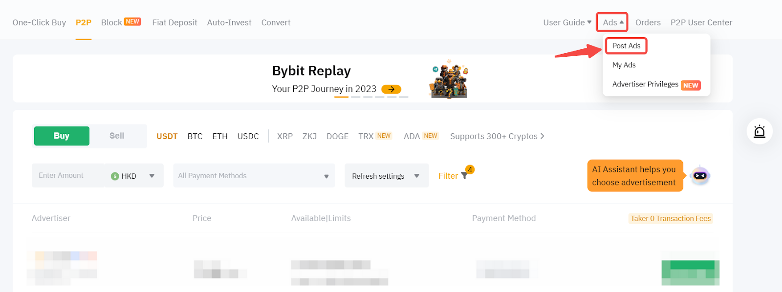 Шаг 2: В правом верхнем углу торговой страницы P2P нажмите Объявления → Разместить объявления.