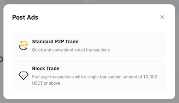 Шаг 3. Нажмите на P2P-трейдинг или Блочный P2P. Условия для публикации объявлений представлены на этой странице.