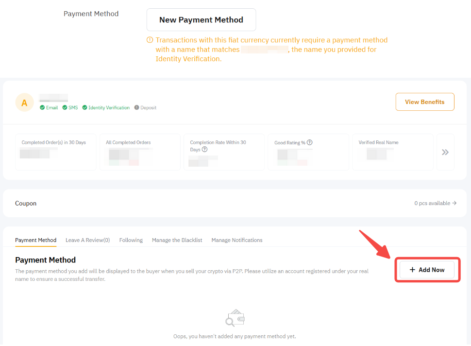 Нажмите на Способы оплаты, и вы будете перенаправлены в P2P центр пользователя для добавления способа оплаты.