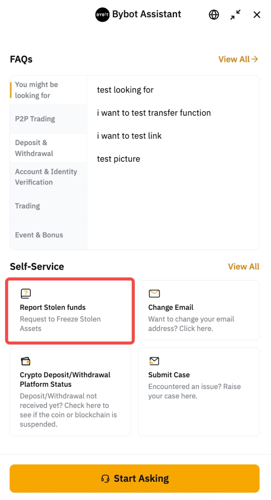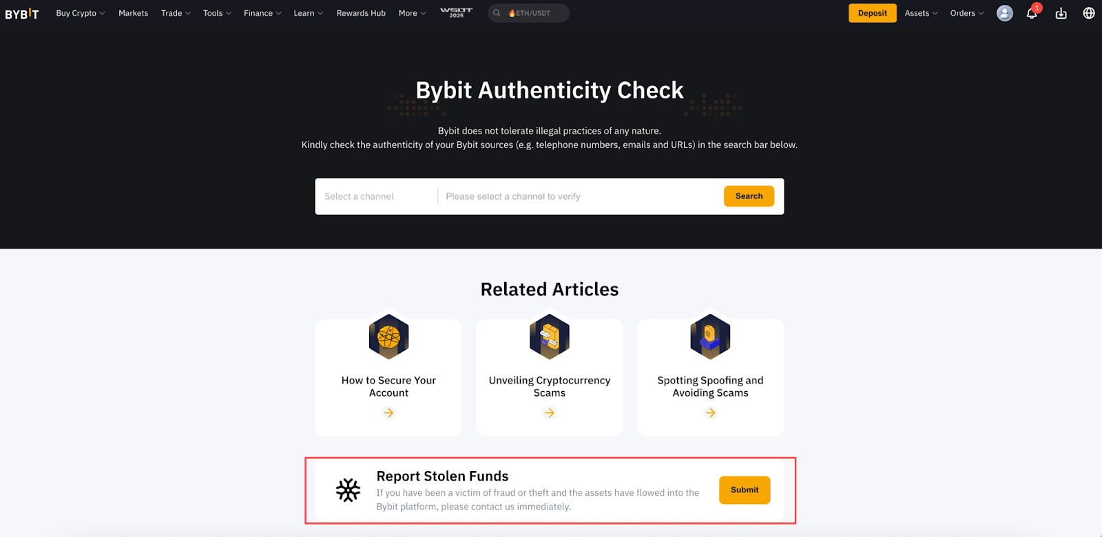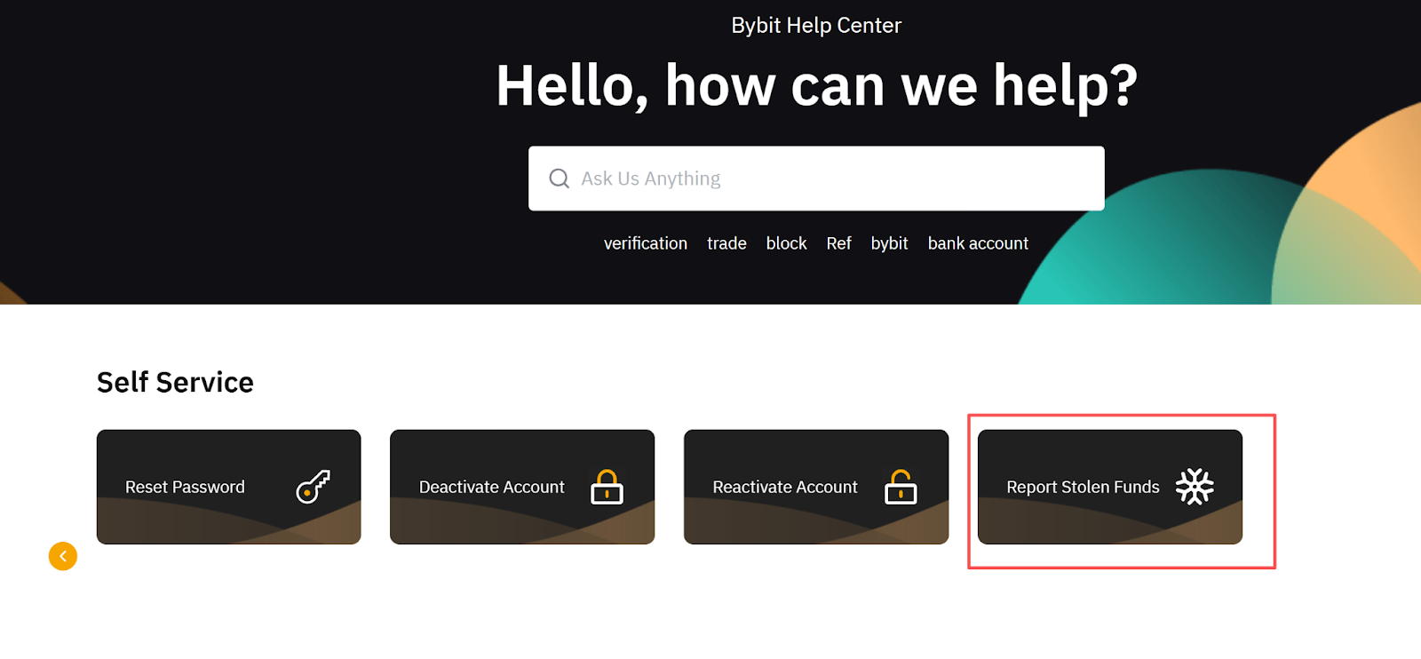 Если вы стали жертвой киберкражи и украденные средства были переведены на Bybit, вы можете сообщить об этом и обратиться за помощью в восстановлении активов к нашей службе безопасности.