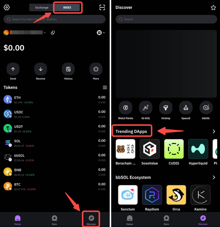 Откройте приложение Bybit, перейдите на страницу Кошелек и нажмите обзор → Trending dApp.