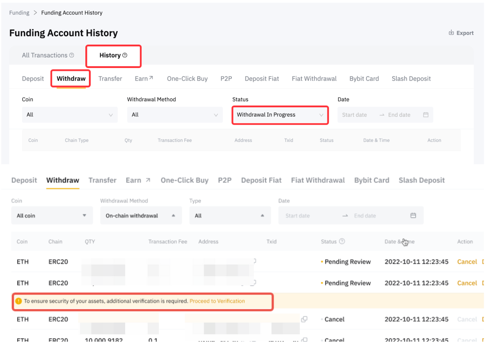 Шаг 2. В разделе фильтра «Статус» нажмите «Вывод выполняется» и найдите ордер, который содержит следующий текст: «Для защиты активов требуется дополнительная верификация. Перейти к верификации». Нажмите «Перейти к верификации».