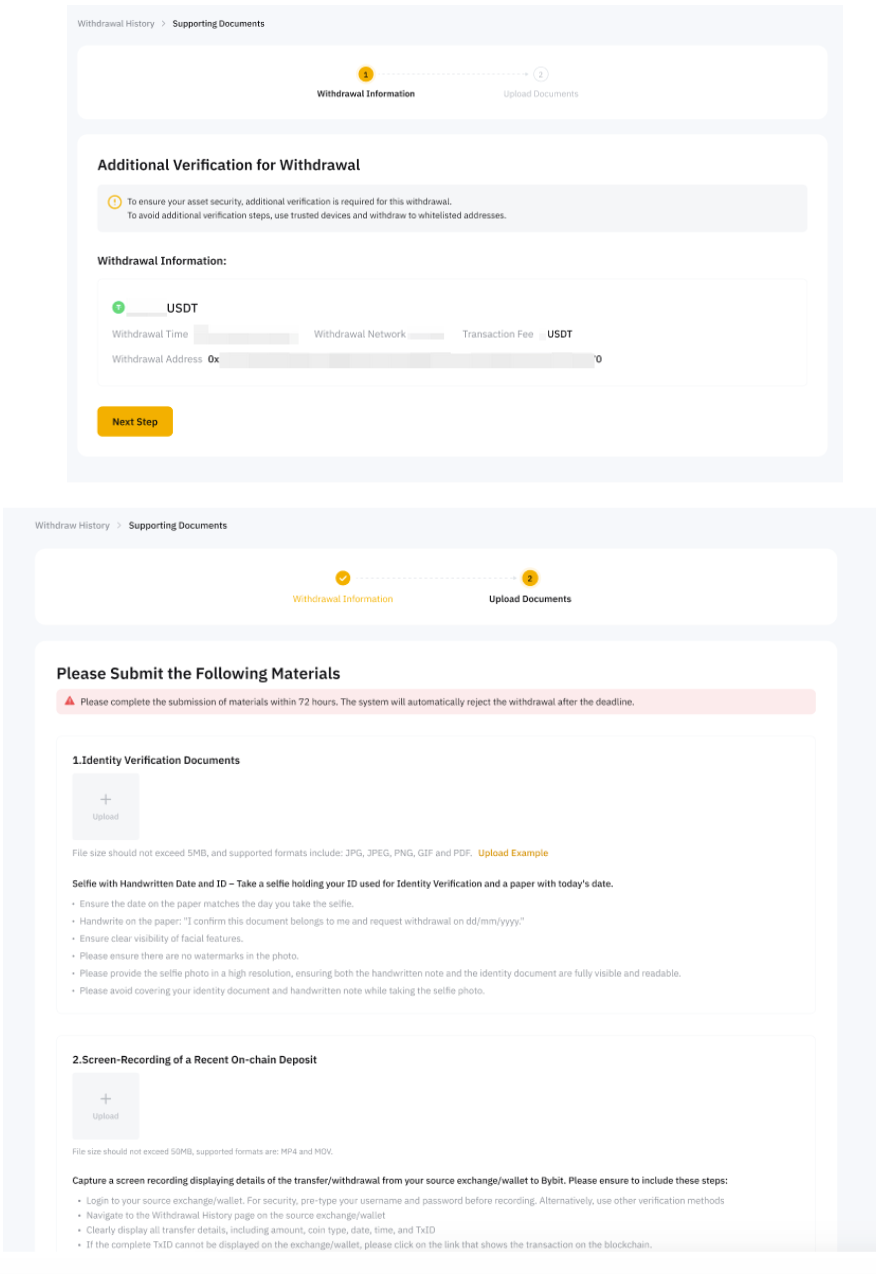 В целях безопасности во время вывода криптовалюты, пользователя могут попросить предоставить дополнительную информацию для подтверждения личности. Непредставление документов в течение 72 часов приведёт к отказу в выводе средств.