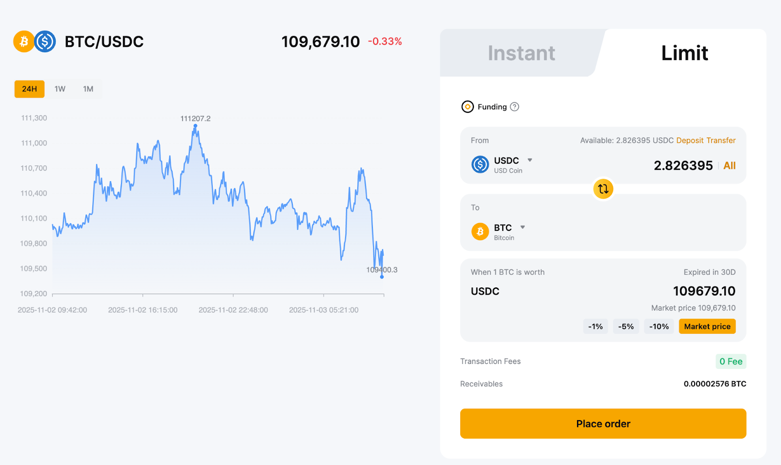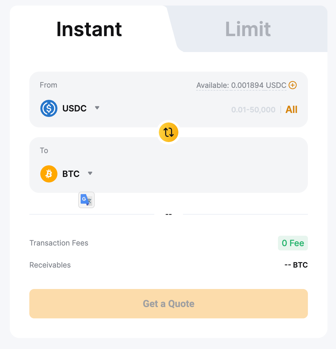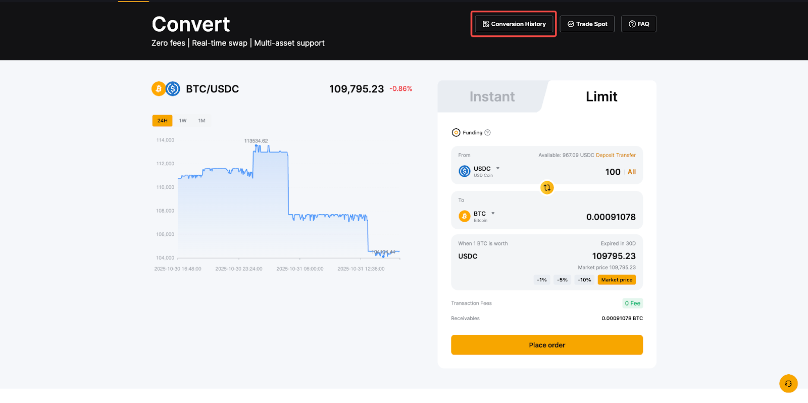 Шаг 2. На странице «Конвертация» выберите режим «Мгновенно» или «Лимит», чтобы преобразовать активы.