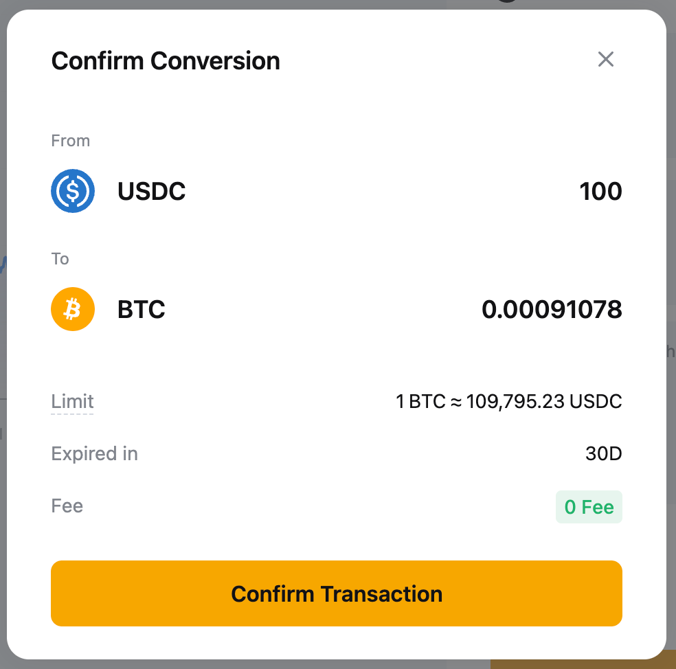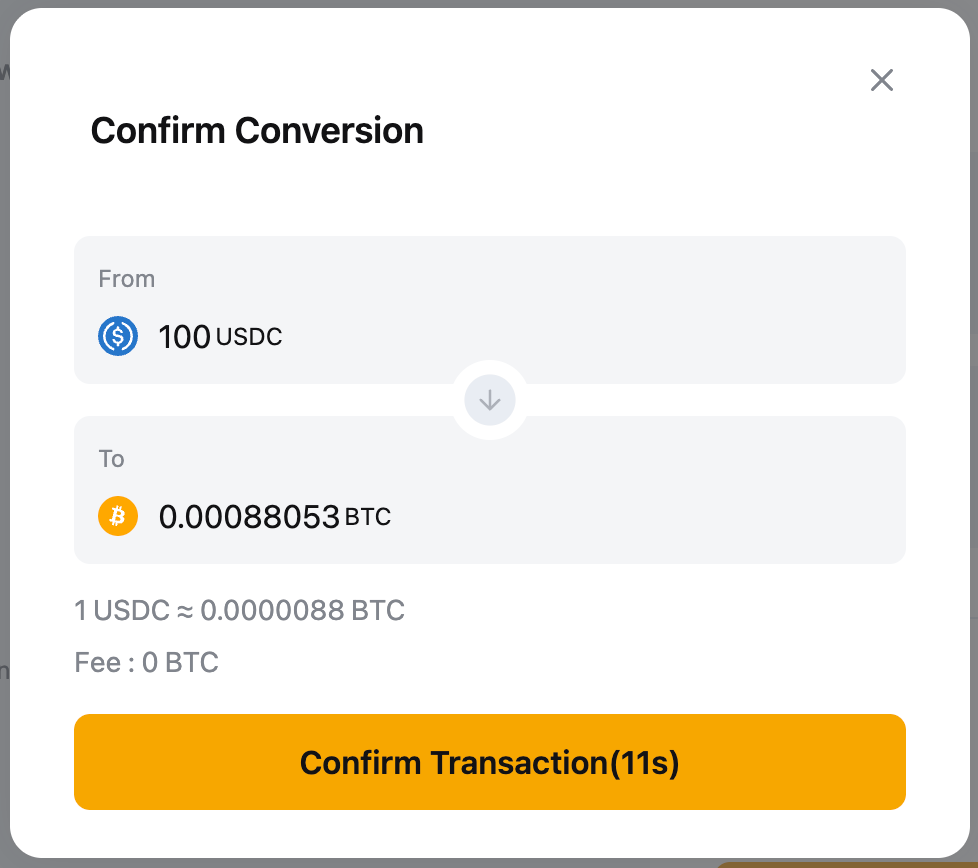 Просмотрите подробную информацию и нажмите «Подтвердить транзакцию», если вы удовлетворены курсом. Транзакция будет выполнена немедленно, и конвертированные активы будут зачислены на выбранный аккаунт.