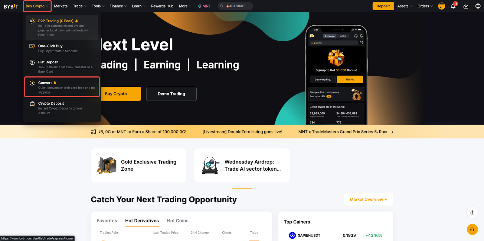 Шаг 1. Выберите Купить криптовалюту на верхней панели навигации и нажмите Конвертация.