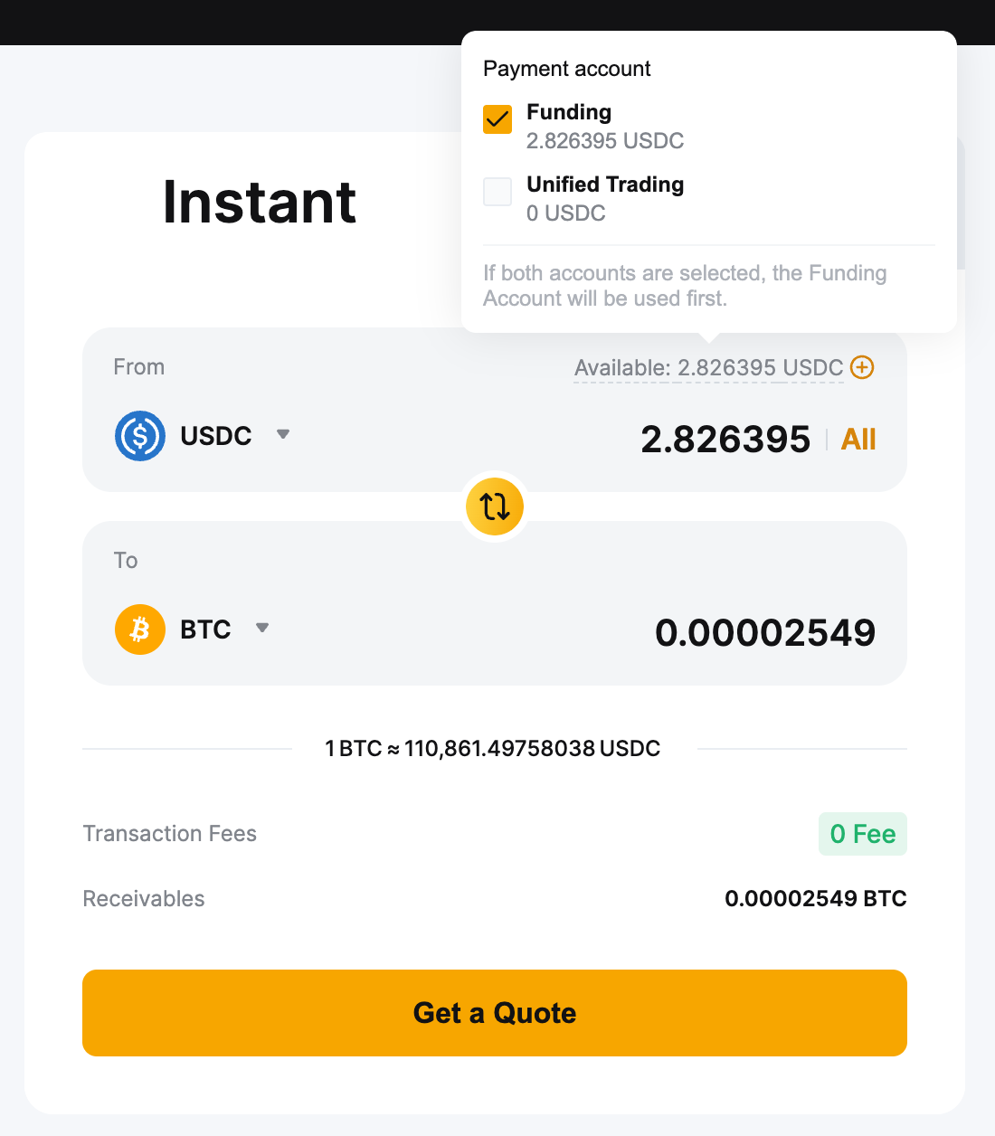 - Мгновенный режим поддерживается как на Аккаунте Финансирования, так и на Едином торговом аккаунте, в то время как Лимитный режим доступен только через аккаунт Финансирования. Прежде чем продолжить конвертацию, пожалуйста, убедитесь, что средства находятся на правильном аккаунте.