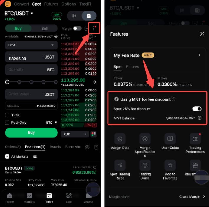 - Торговля на споте: покупайте MNT с помощью рыночных или лимитных ордеров.