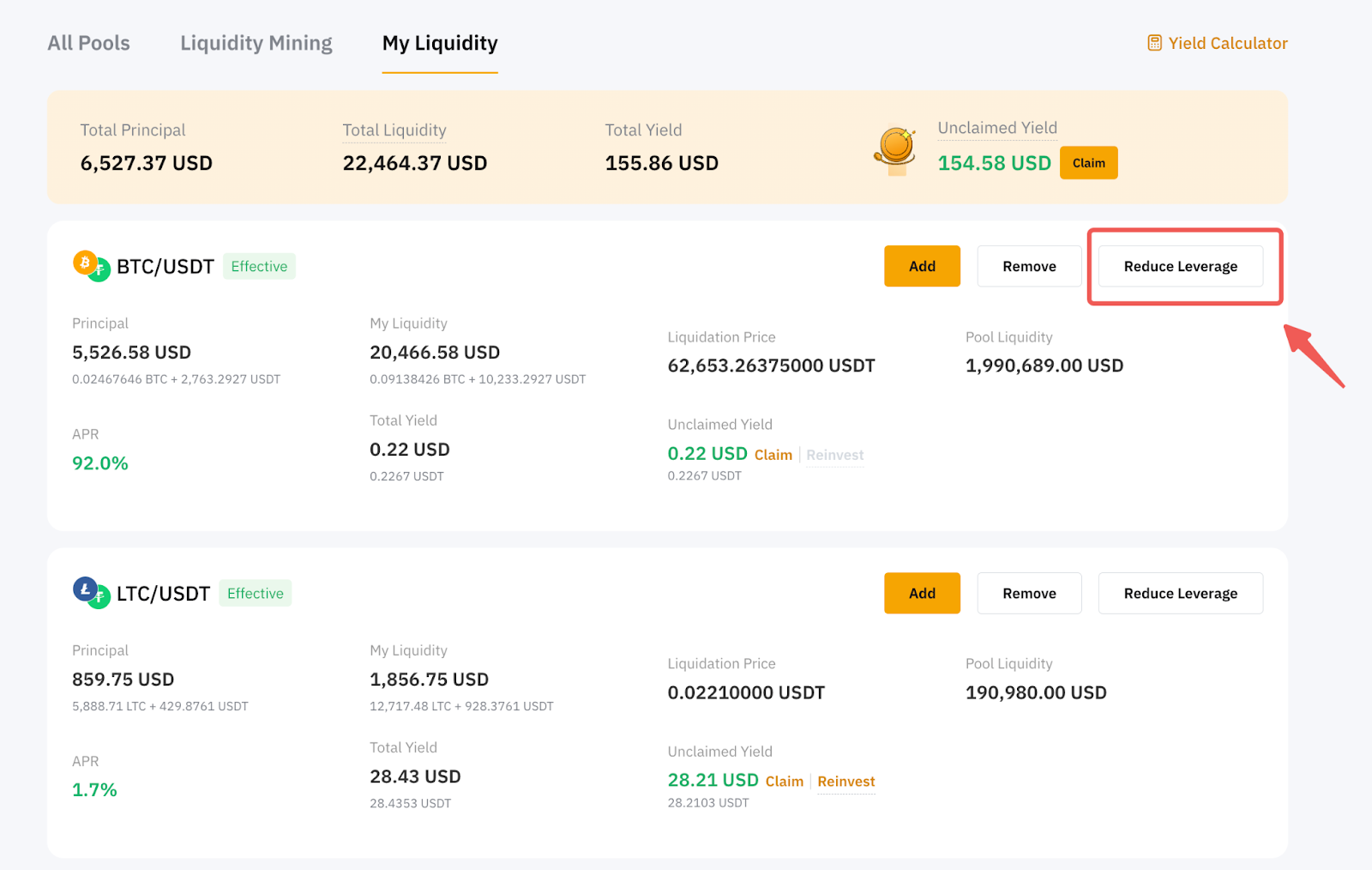 Шаг 2. Выберите пул ликвидности, для которого вы хотите уменьшить кредитное плечо, и введите сумму.