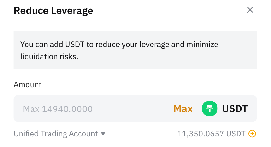 Обратите внимание, что максимальная сумма USDT, которую вы можете добавить, является частью займа с кредитным плечом. Когда вы добавляете максимальную сумму, кредитное плечо вашей позиции будет уменьшено до 1х.