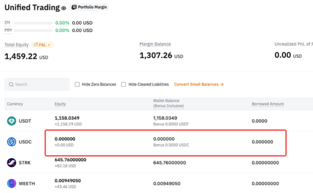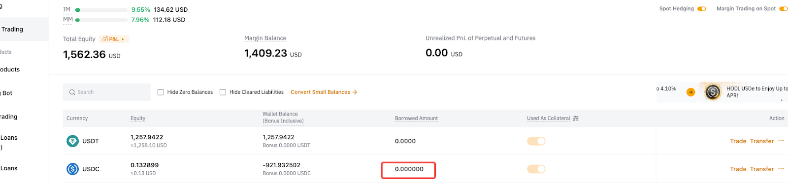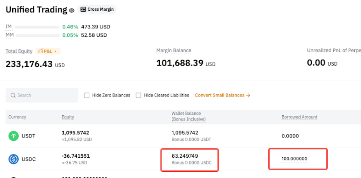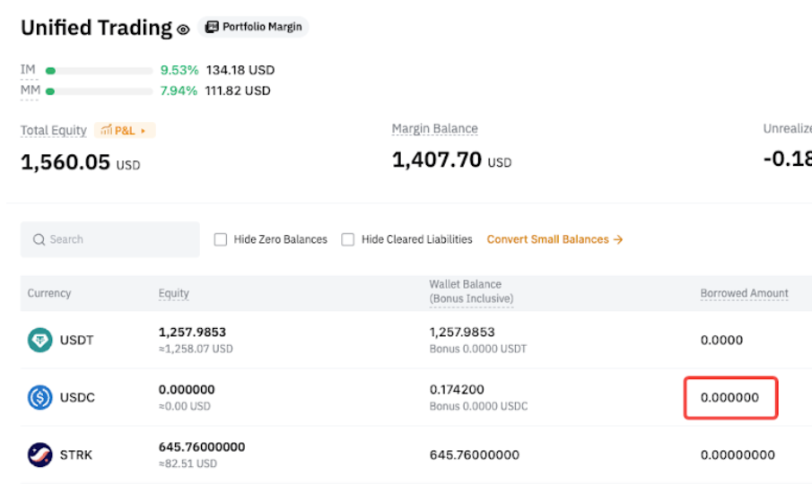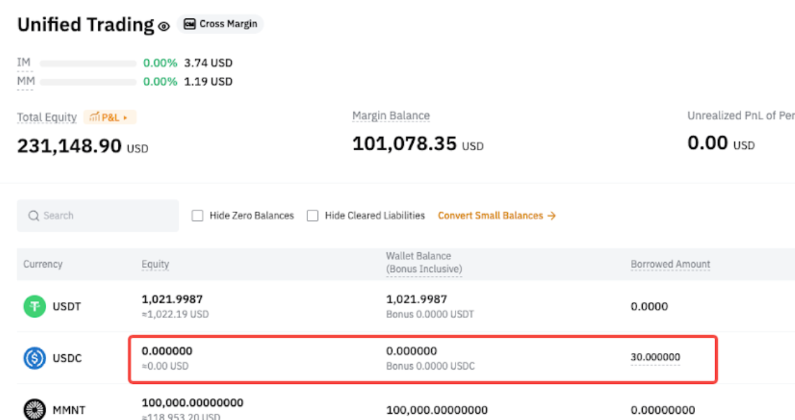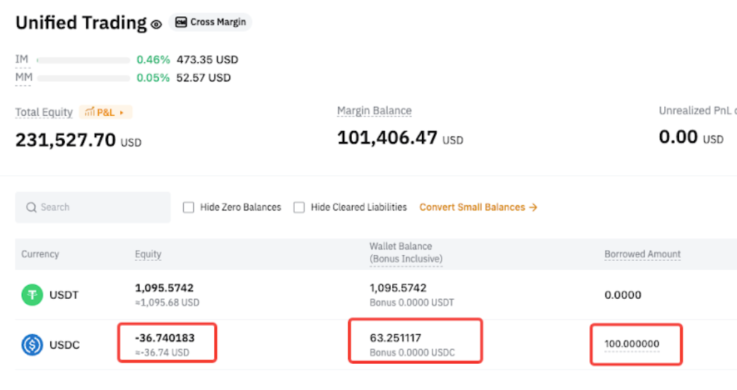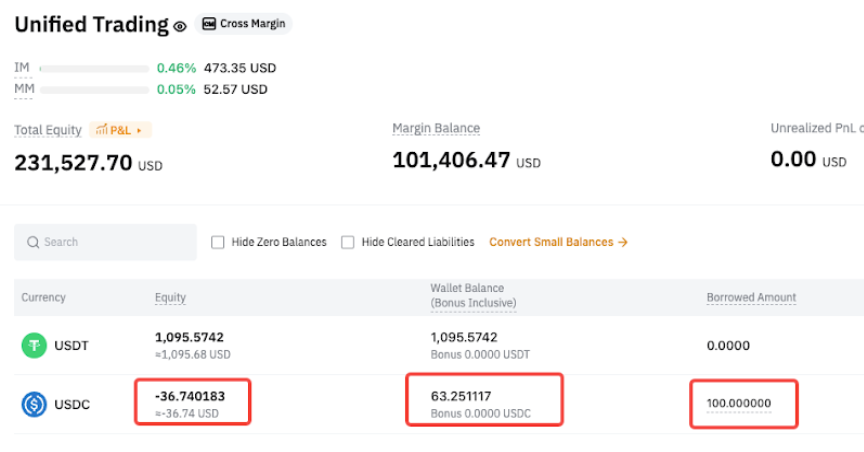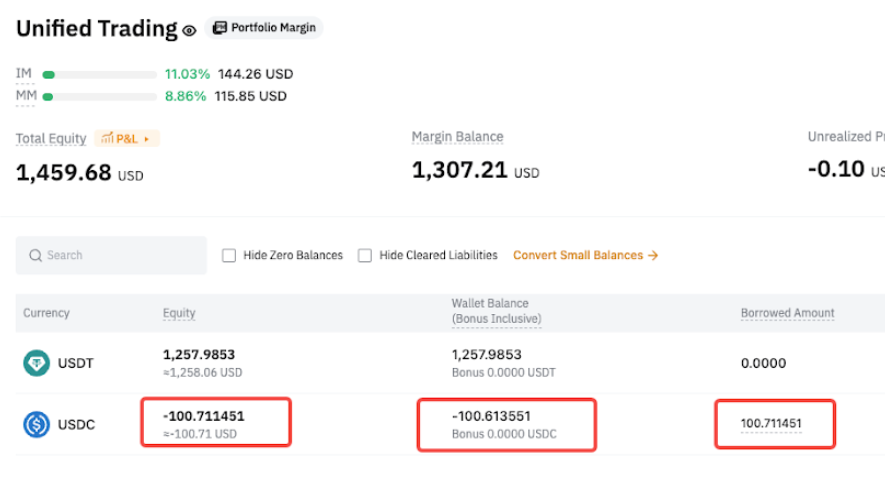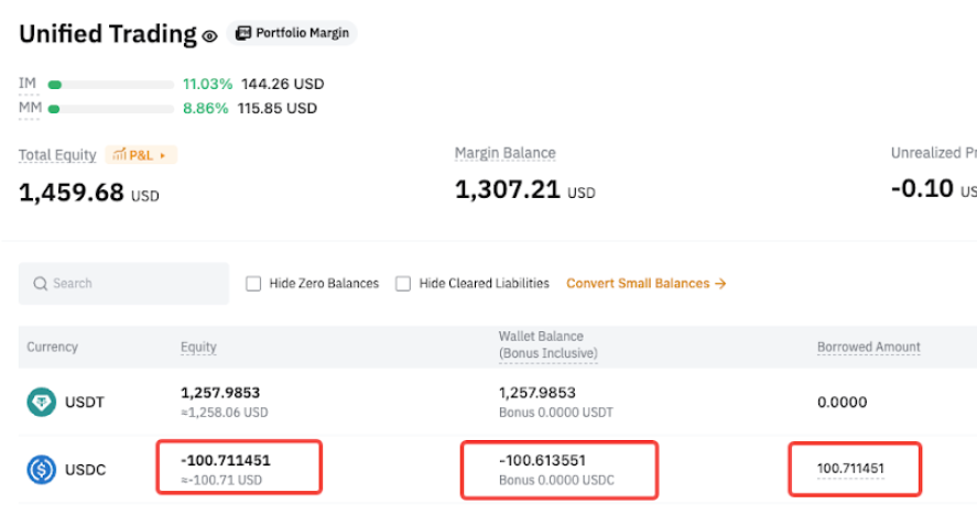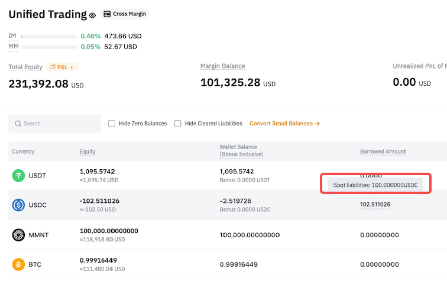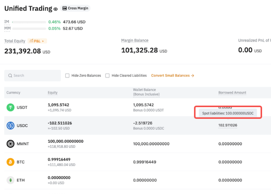 После перевода в USDC автоматически погашаются только обязательства по деривативам, а обязательства по споту остаются непогашенными. - Спотовые обязательства = 100