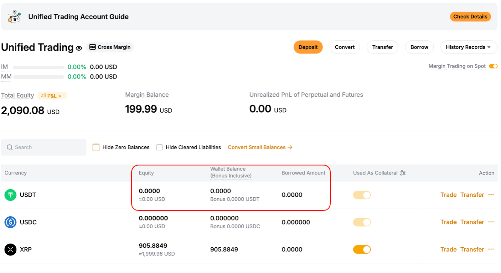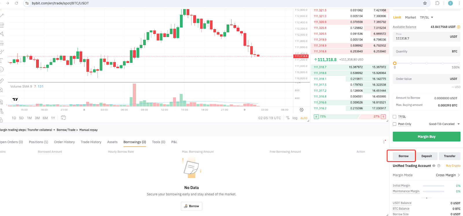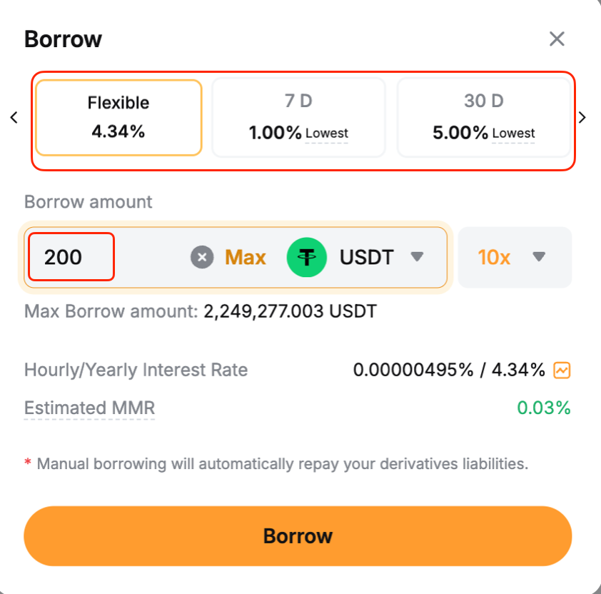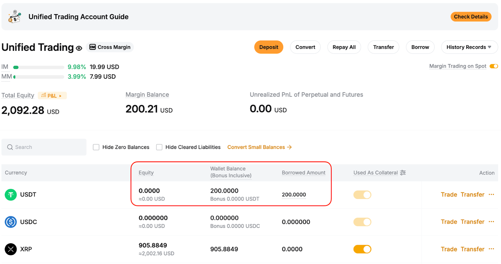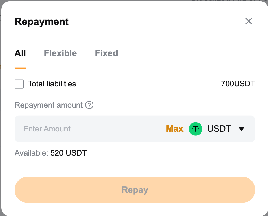 Например, если вы заимствовали BTC, но в настоящее время у вас их нет, покупка BTC в USDT через пару BTC/USDT Спот будет автоматически считаться погашением. BTC, который вы получаете, рассматривается как перевод на ваш Единый торговый аккаунт.