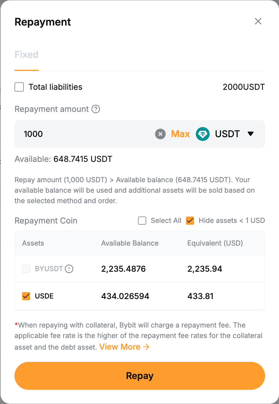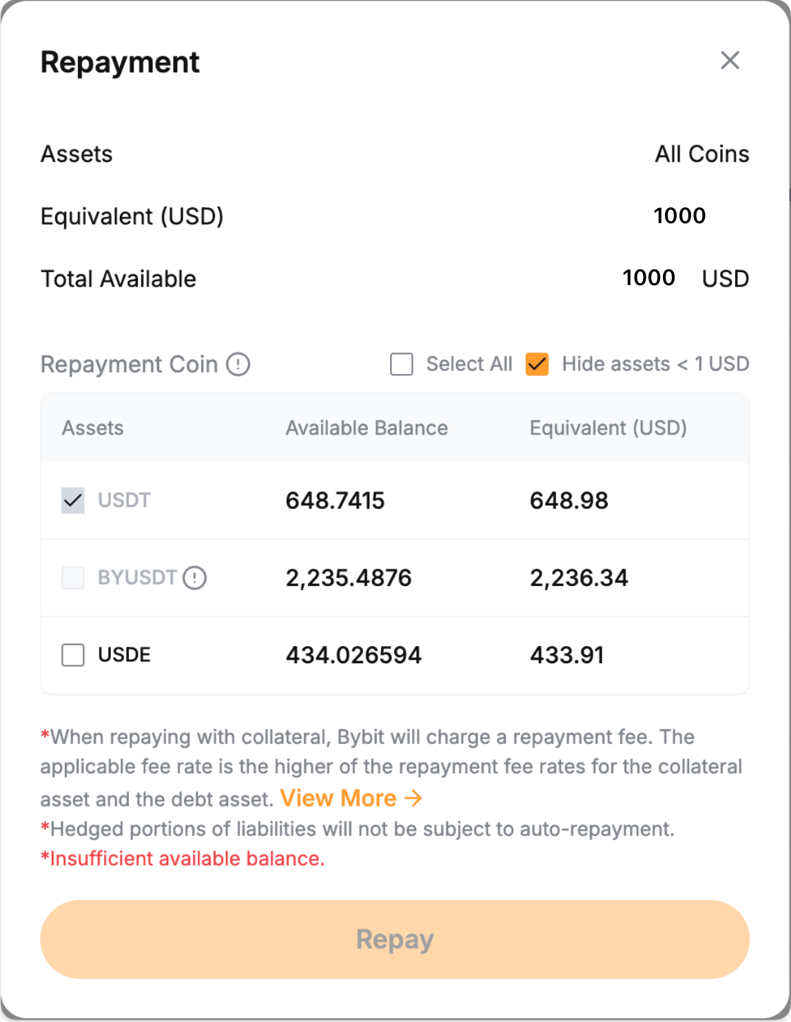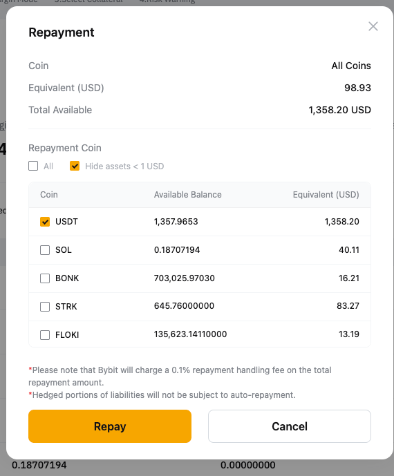 Шаг 2. Сначала система использует доступную вам заемную монету для погашения. Любая оставшаяся сумма будет покрыта конвертацией вашего выберите монету для погашения.