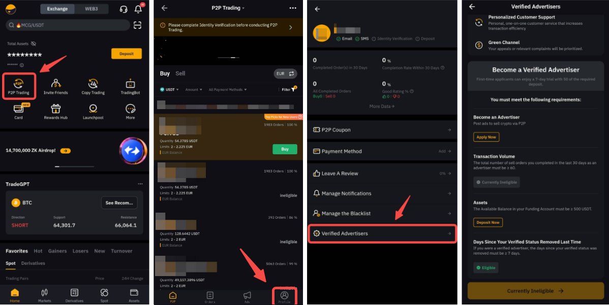 Если вы используете приложение, перейдите на страницу P2P и нажмите на иконку профиля, чтобы открыть Центр пользователя P2P. Нажмите на Преимущества мерчанта, чтобы открыть соответствующую страничку.