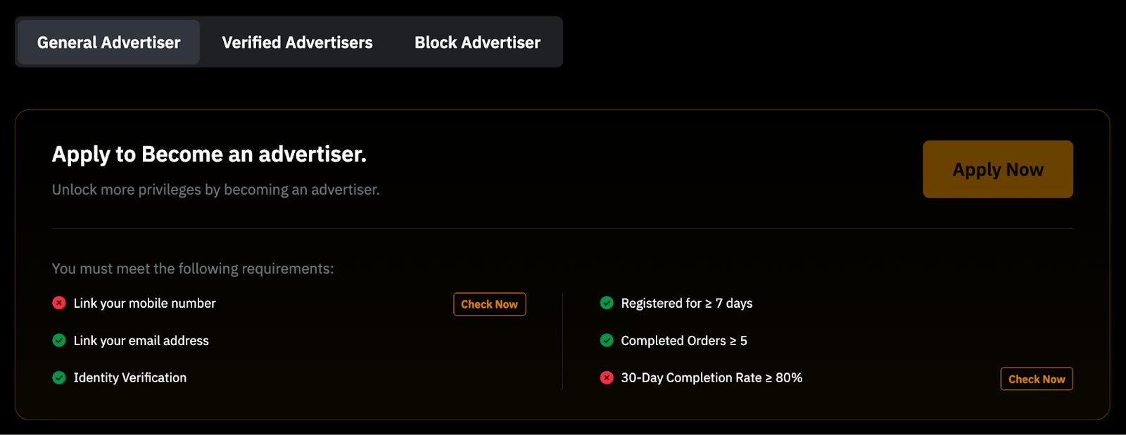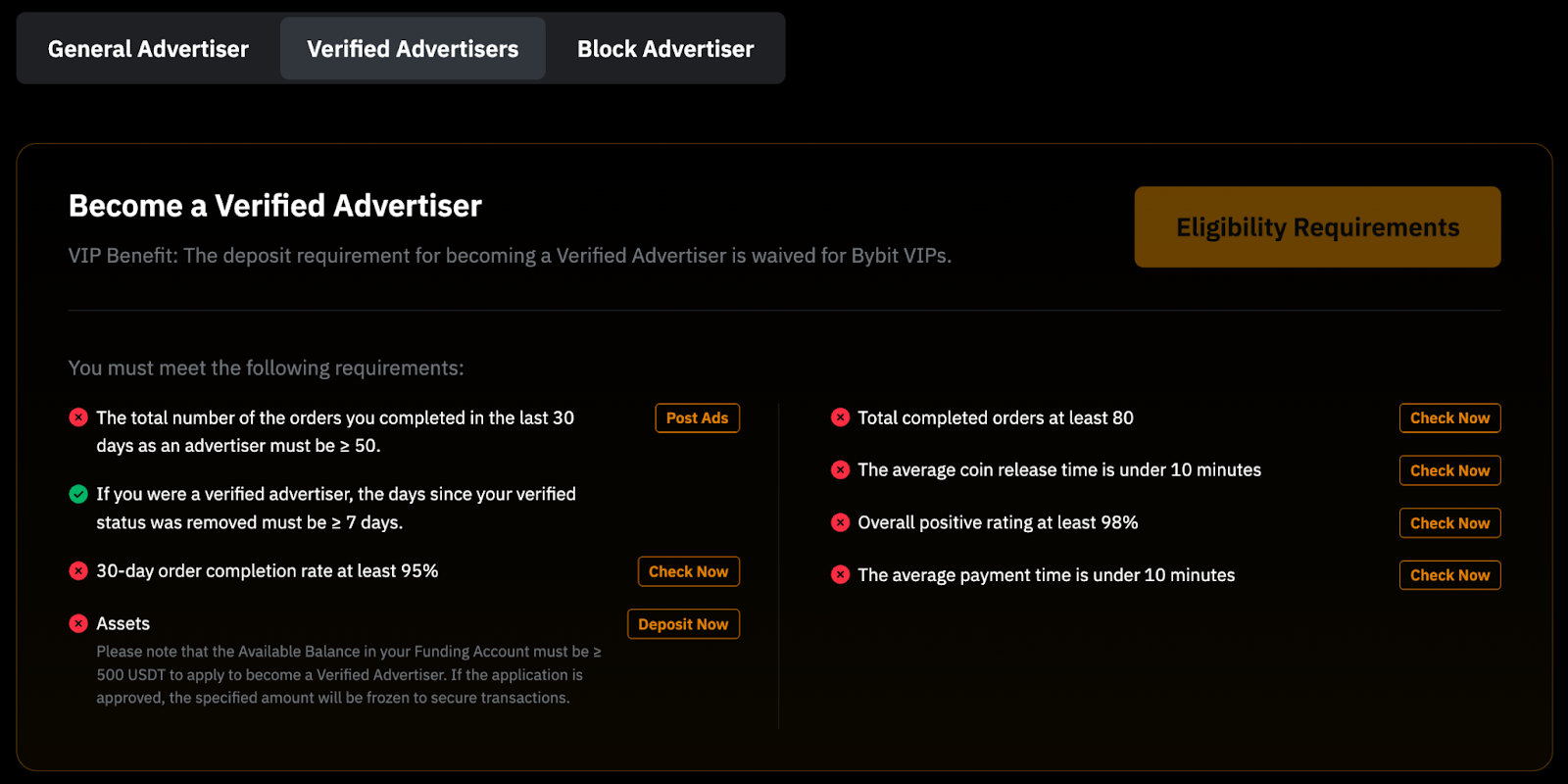 Чтобы стать проверенным мейкером, нажмите Активы → Преимущества мерчанта и перейдите на страницу Преимущества мерчанта на сайте. Здесь отобразится список требований, а также текущий статус вашего аккаунта по каждому из них.