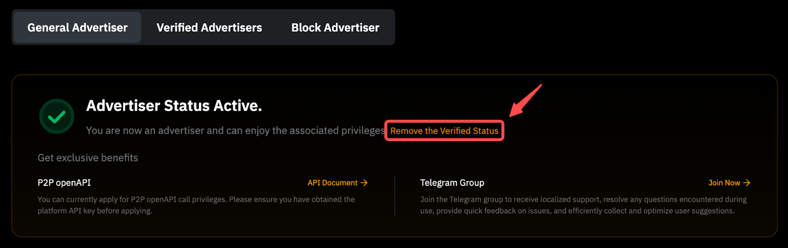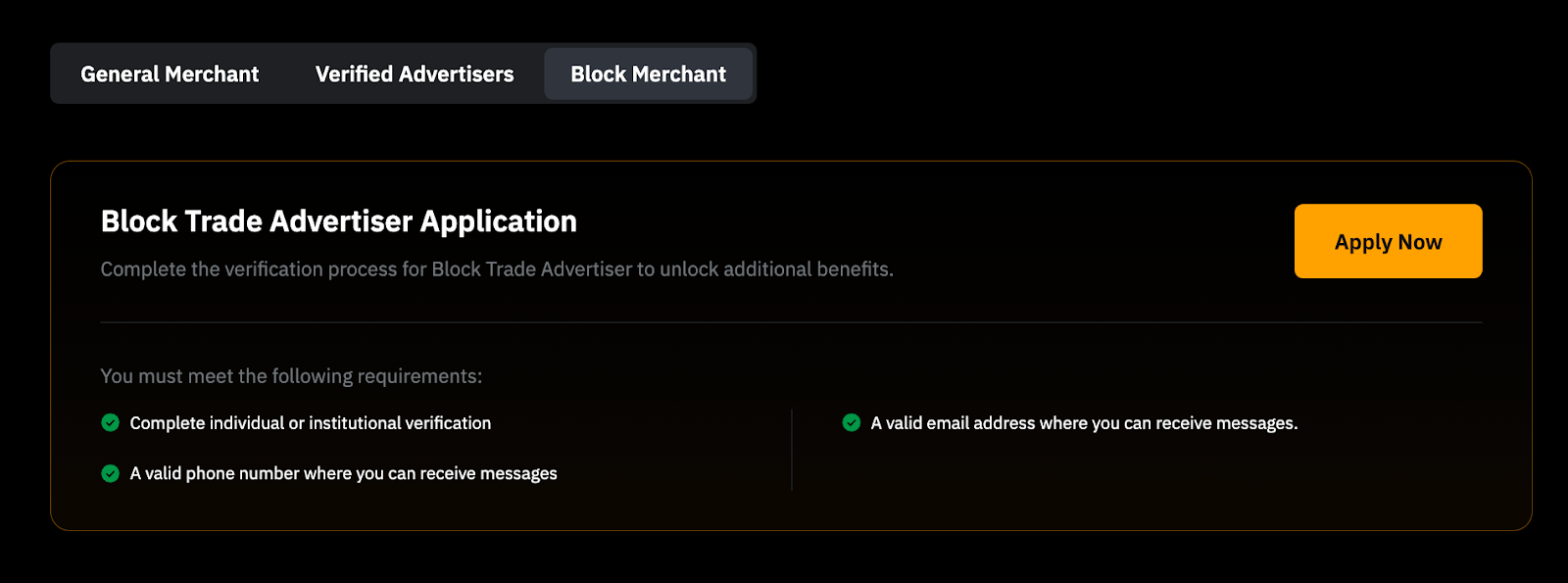 Чтобы стать проверенным мейкером или блок-мейкером, необходимо ознакомиться с соответствующими требованиями и подать заявку на получение статуса, перейдя на страницу Программы для мерчантов P2P.