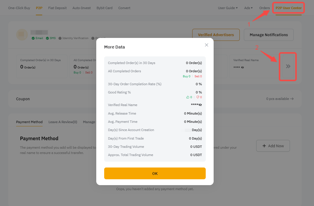 Чтобы проверить, имеете ли вы право на один из уровней стандартного мерчанта, ознакомьтесь с данными своего P2P-аккаунта, нажав на Центр пользователя P2P, а затем на значок с 2 стрелками вправо на веб-сайте.