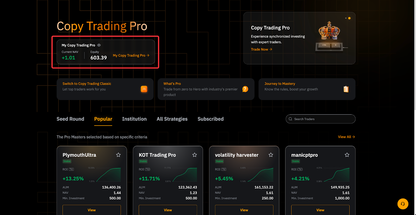 要访问您的 Pro 交易达人中心,请切换到您的 Pro 交易达人子账户 → 跟单交易 Pro,然后点击我的跟单交易 Pro 卡。