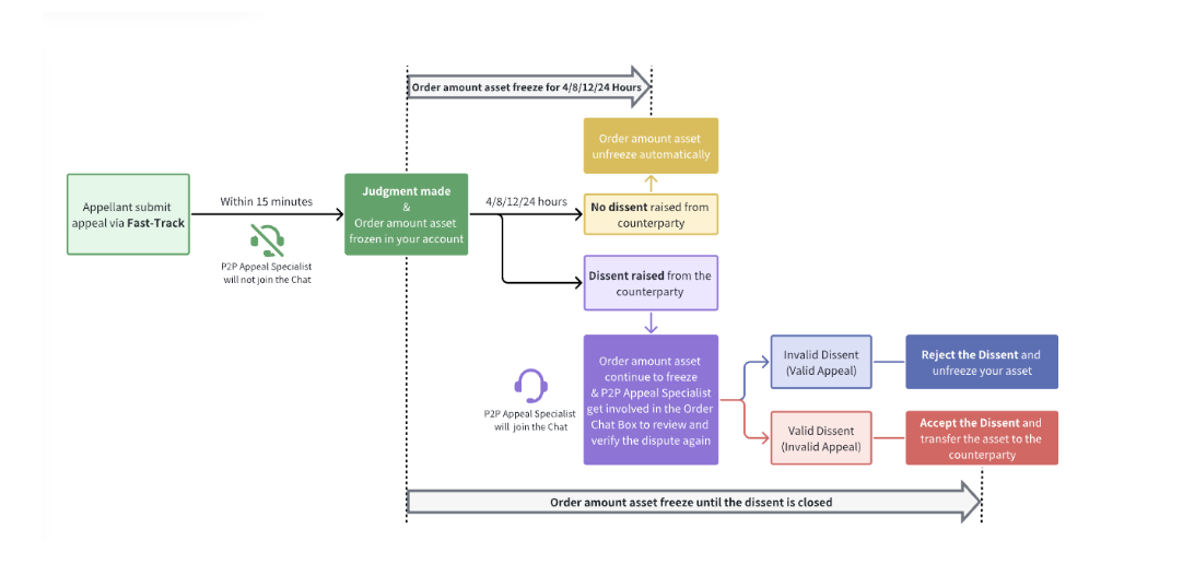 通過快速通道提交申訴時,將被在15分鐘內作出判斷,P2P 申訴專員不會參與訂單對話框。 完成判斷后,訂單金額將暫時凍結 4、8、12 或 24 小時,以便交易對手確認結果。 凍結時間因策略而異, 具體凍結時間請參閱介面。